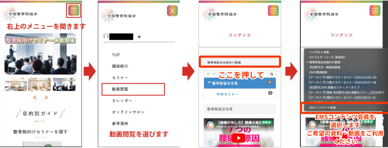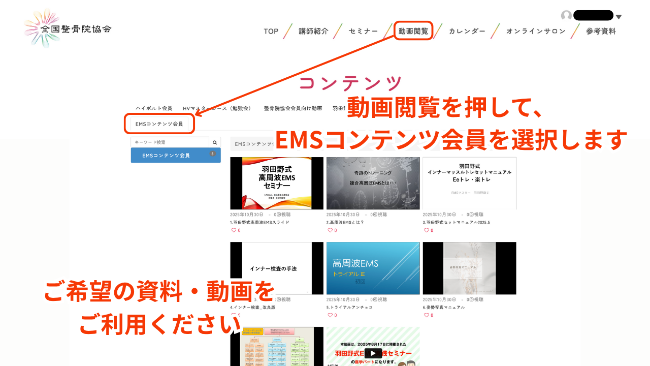 資料および動画コンテンツは1〜2営業日後にご利用可能となります。後日送付されるメールに記載されたURL、もしくは「動画閲覧」から「羽田野式EMSコンテンツ」を選択していただきご利用ください。